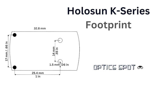 Holosun K-sarjan kuvio koostuu kahdesta liitännästä tähtäimen etukulmien edessä ja kahdesta ruuvinreiästä tähtäimen takana.
