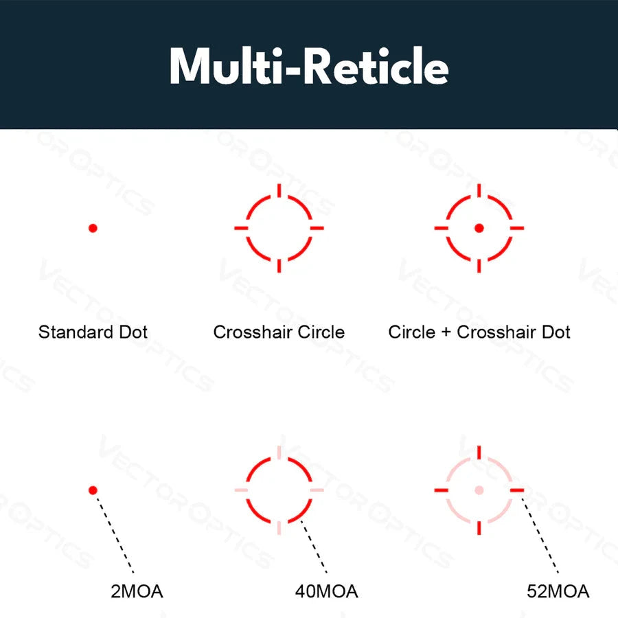 Siinä on myös kolme valittavaa tähtäinkuviota, liikeanturi (automaattinen sammutus 2 minuutin käyttämättömyyden jälkeen, ja käynnistyy uudelleen heti, kun optiikkaa liikutetaan) sekä yhteensä kymmenen kirkkaustasoa (mukaan lukien 2 pimeänäkötasoa).